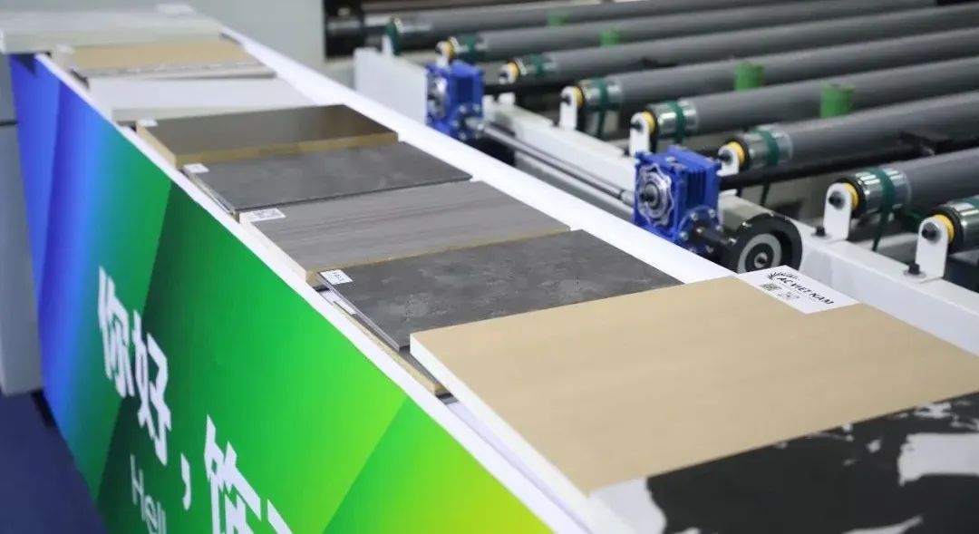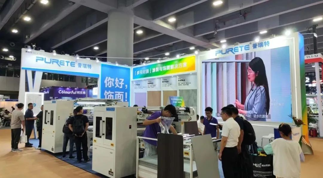 展會(huì)現(xiàn)場(chǎng)展示PUR平貼線。有SPC、碳晶板、歐松板等多種基材,現(xiàn)場(chǎng)演示EB膜、PVC仿生膜、PVC木紋膜等多種飾面膜的貼面效果。為客戶提供個(gè)性化,六面一體的多元材質(zhì)空間,涂裝與飾面解決方案。